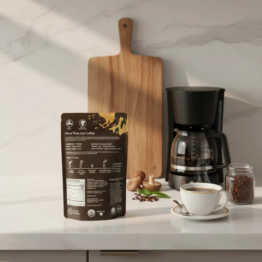 Our mushroom coffee contains a variety of ingredients such as Lion's Mane (improves concentration and memory), Turkey Tail (supports intestinal balance), Cordyceps (energy and immune support), Reishi (regulates hormones, sleep and mood).